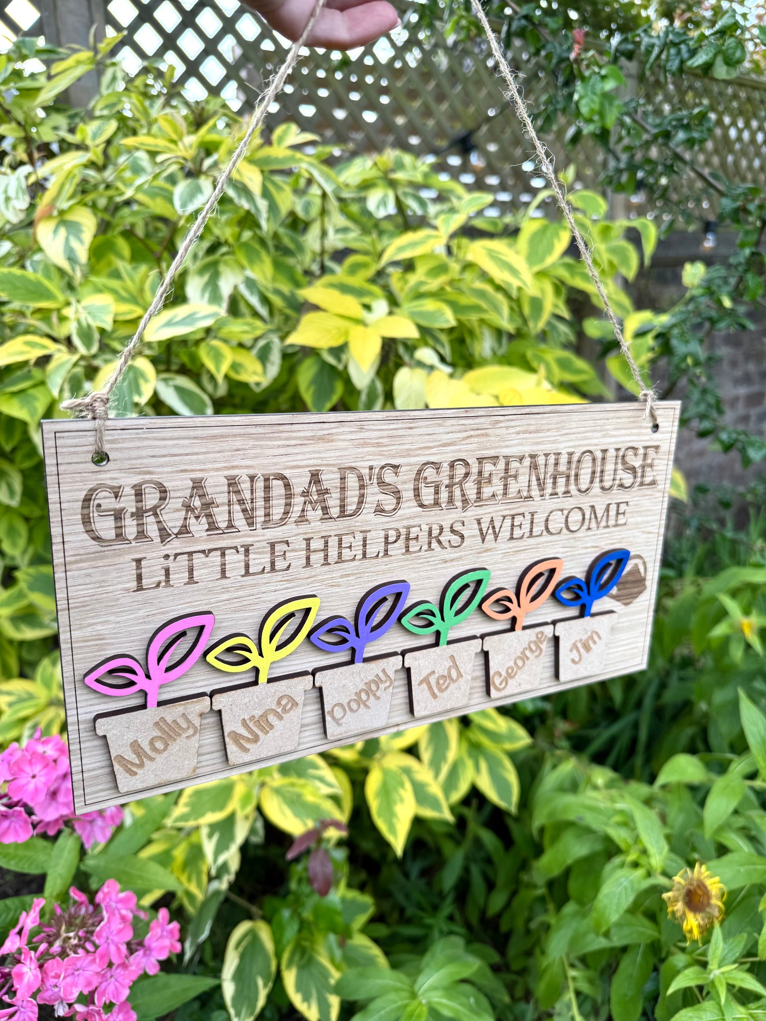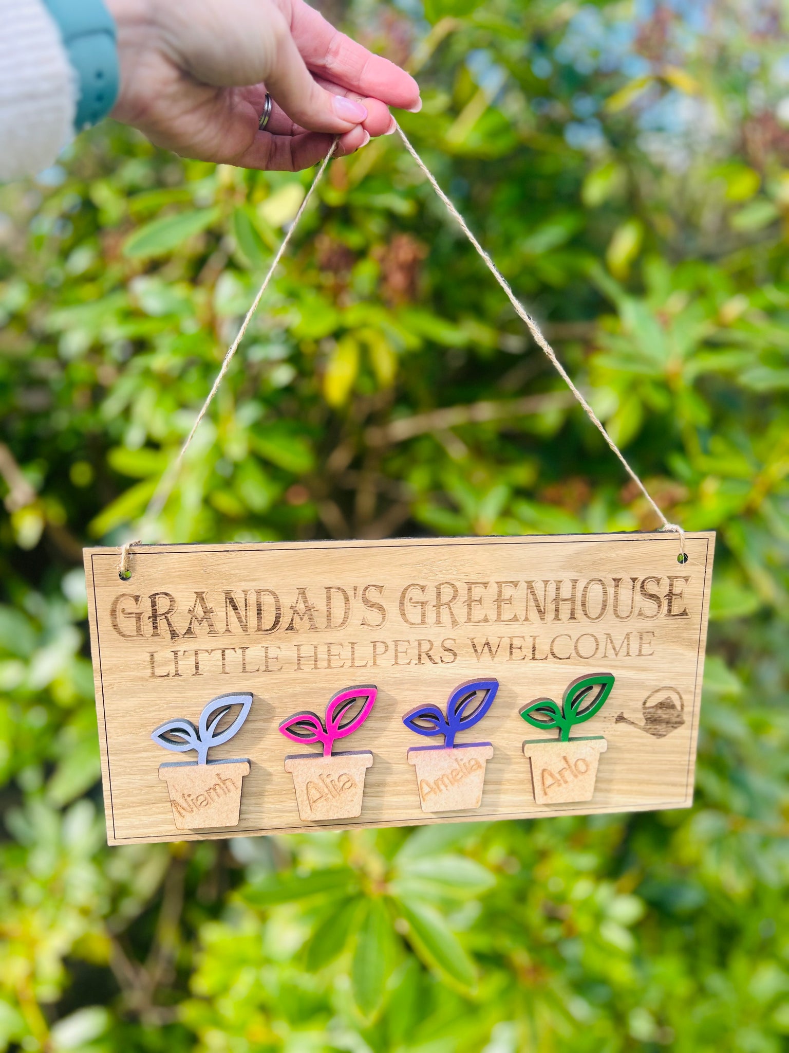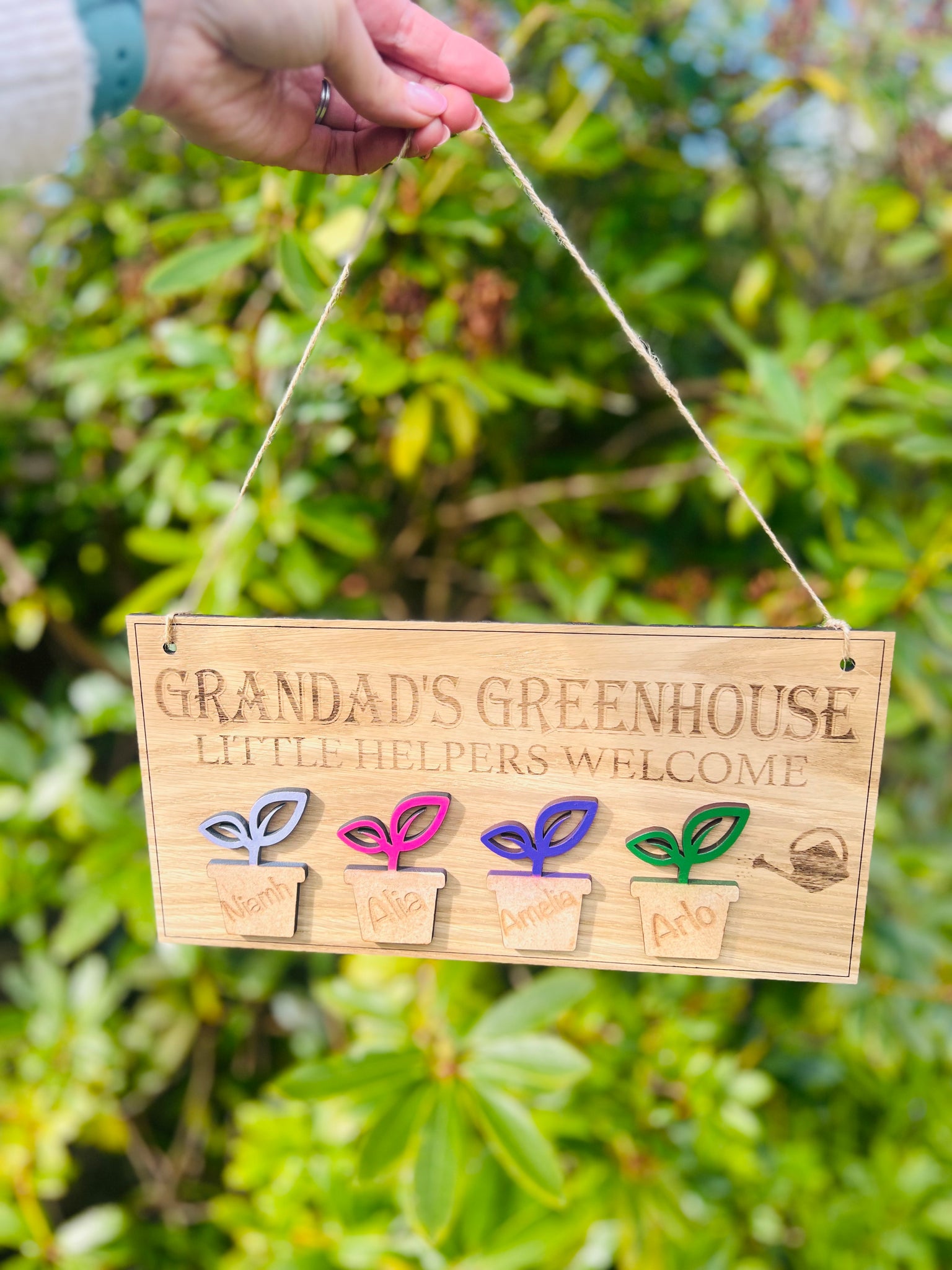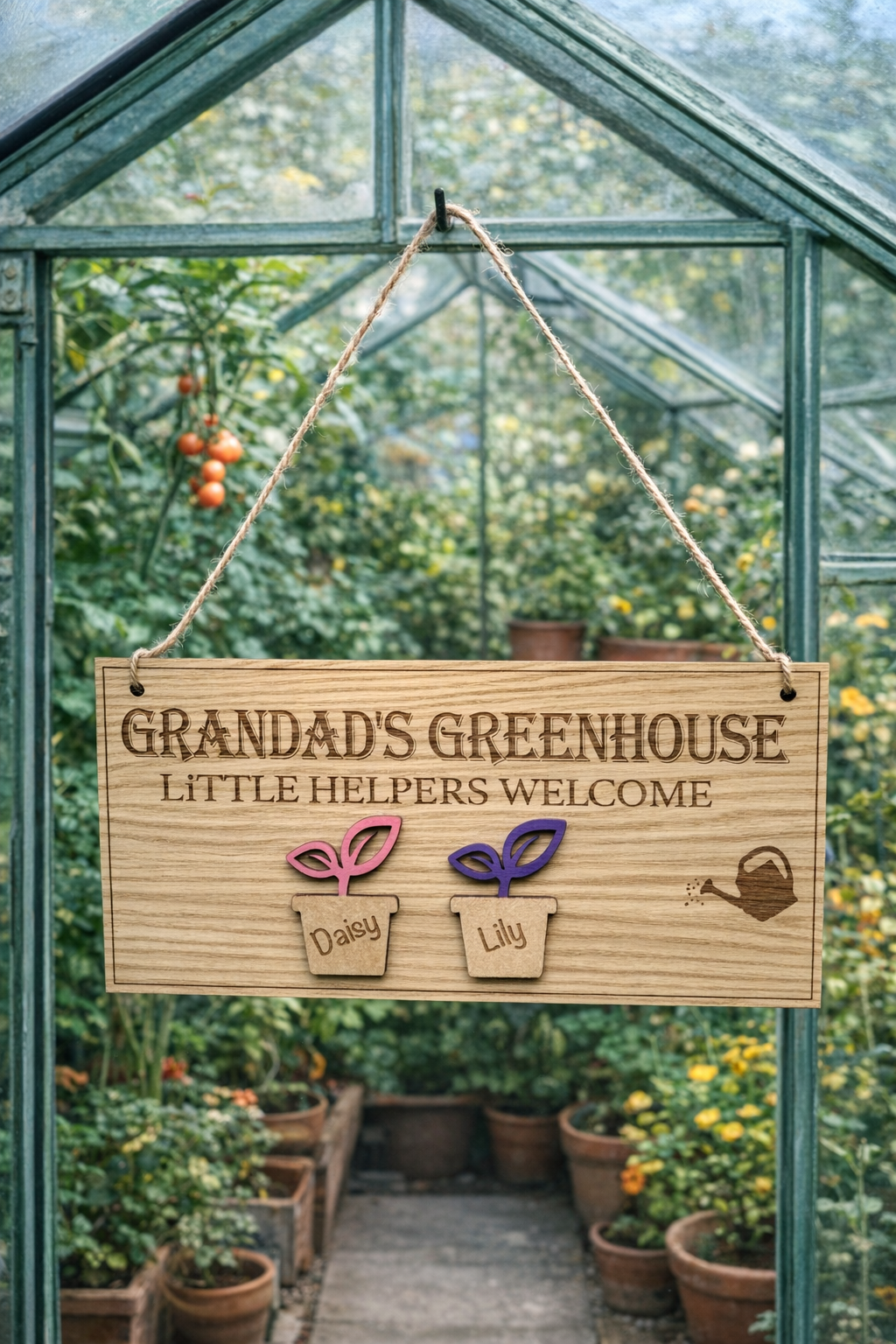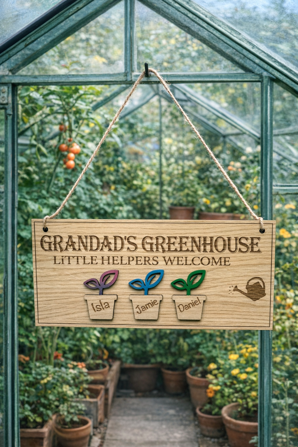 Welcome your little gardeners with this charming personalised wooden greenhouse sign! Handcrafted with love, our "Grandad's Greenhouse" plaque is the perfect gift for a green-thumbed grandparent. Featuring engraved names in mini plant pots and vibrant wooden leaves, this sign is a sweet way to celebrate the special bond between Grandad and his little helpers.