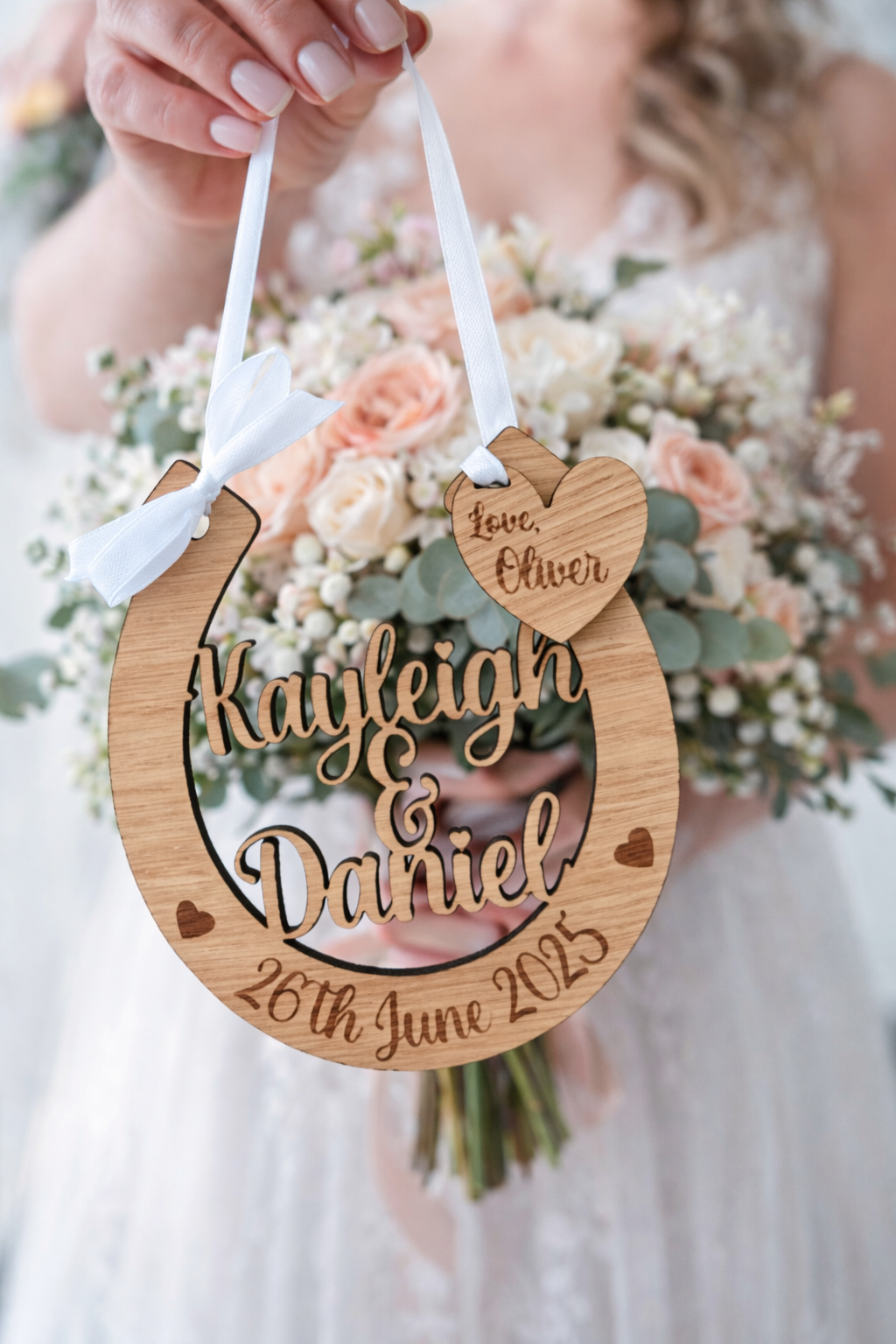 Handmade oak personalised wooden horseshoe engraved with names and date. Perfect rustic wedding décor, bridal bouquet charm, and meaningful wedding keepsake gift.